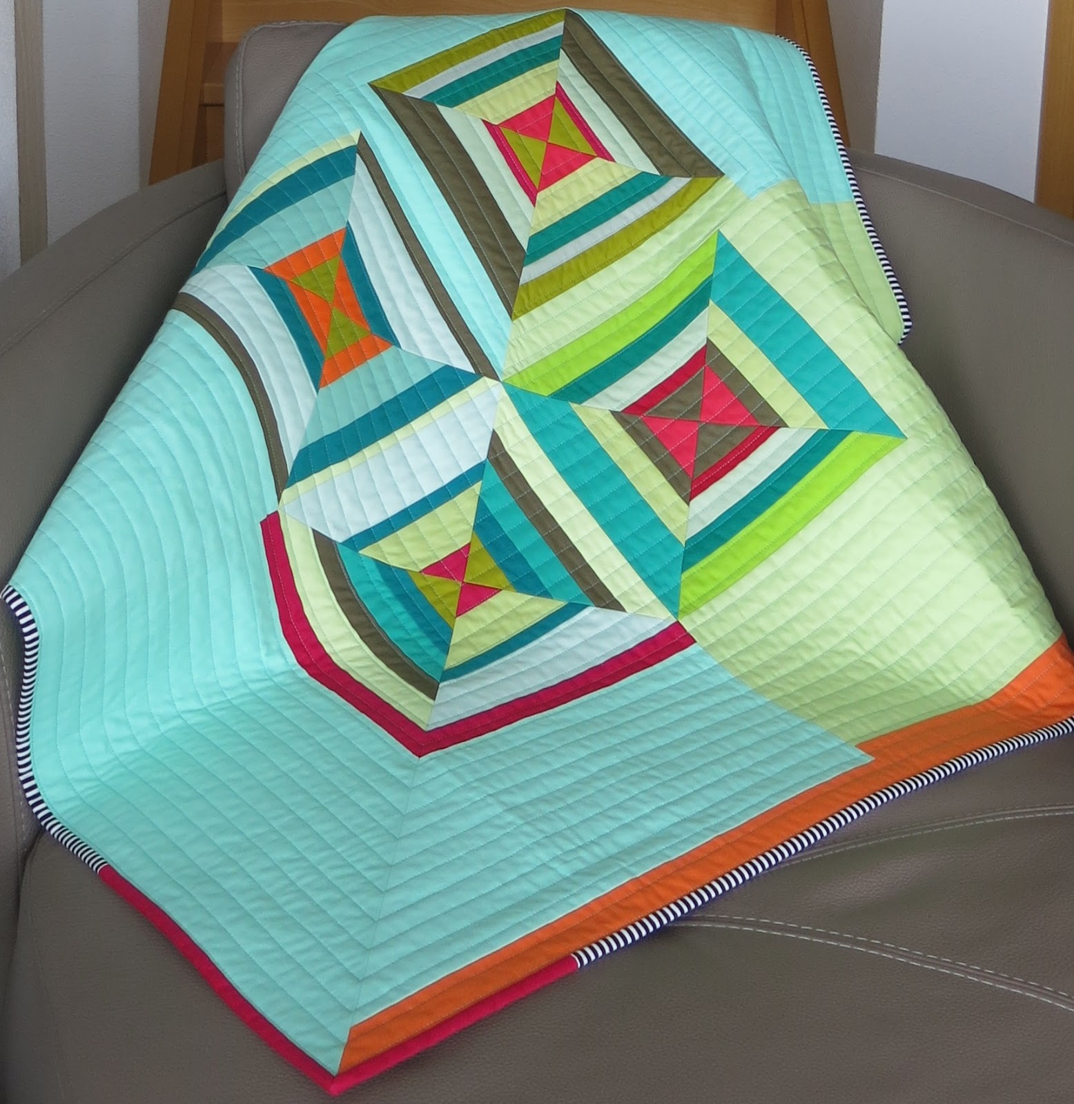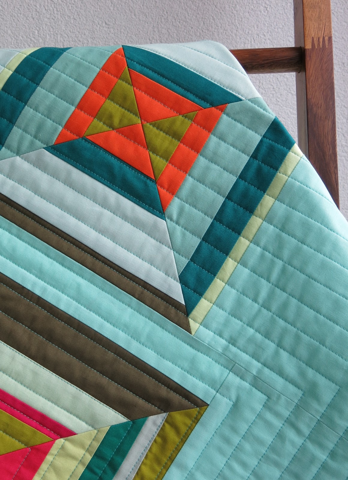 Pour accentuer la disposition irrégulière, j’ai quilté des carrés concentriques en commençant dans le bloc le plus décentré.