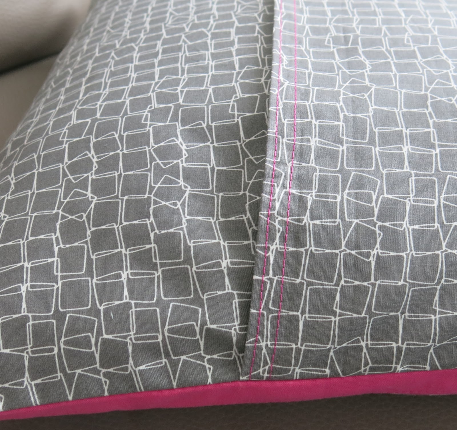 I really like the pillow – such fun colours and fabrics. And the pink topstitching on the back is a super fun idea!!
