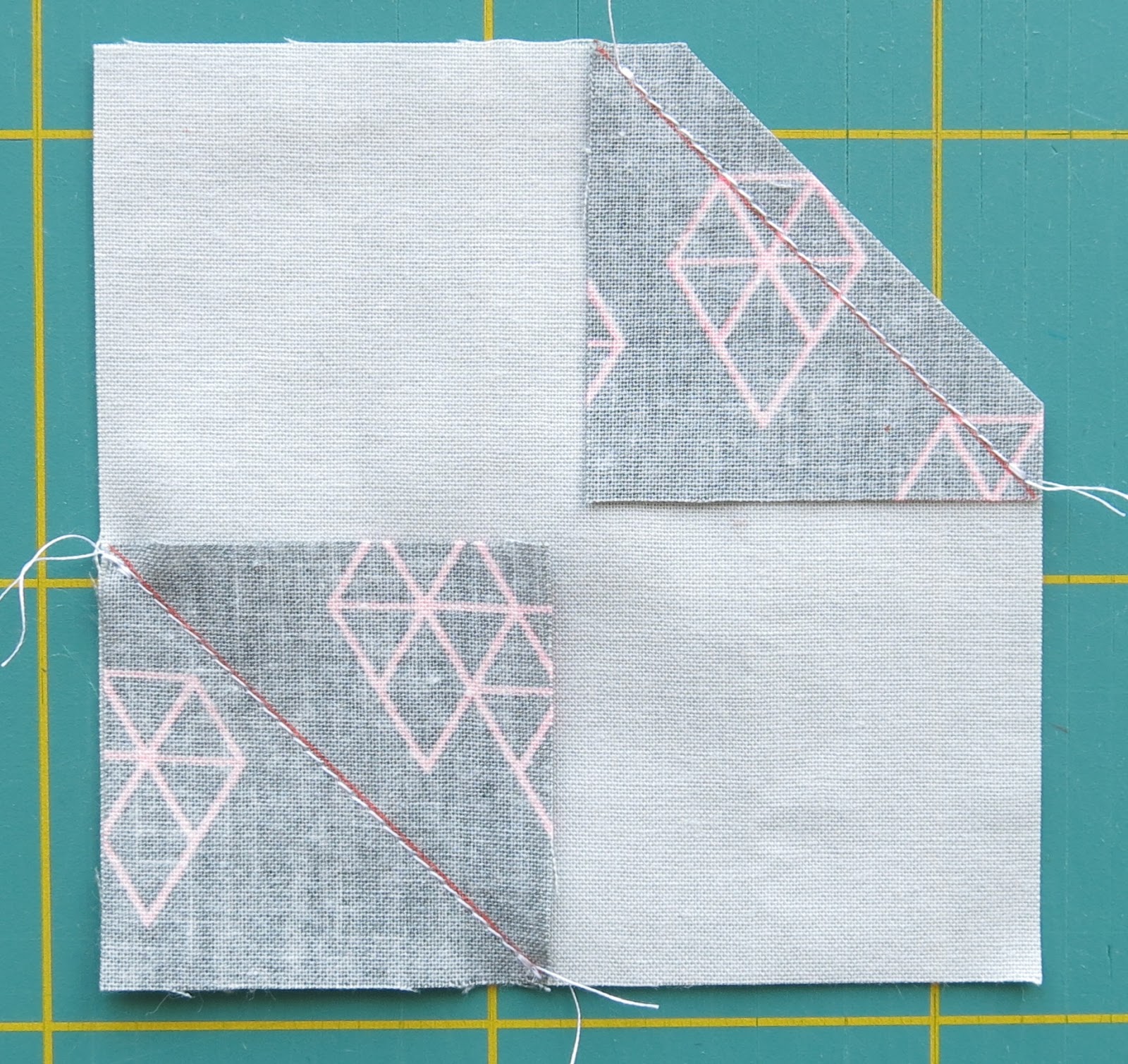 Présenter un bloc avec des triangles s’est révélé être un bon choix. C’est peut-être évident pour une quilteuse de couper et coudre des carrés pour obtenir des triangles à la fin mais c’était une découverte amusante pour des débutantes. Elles ont appris entre autres comment travailler avec le matériel de coupe, quelques notions de base pour piécer et le quilting en lignes droites.
