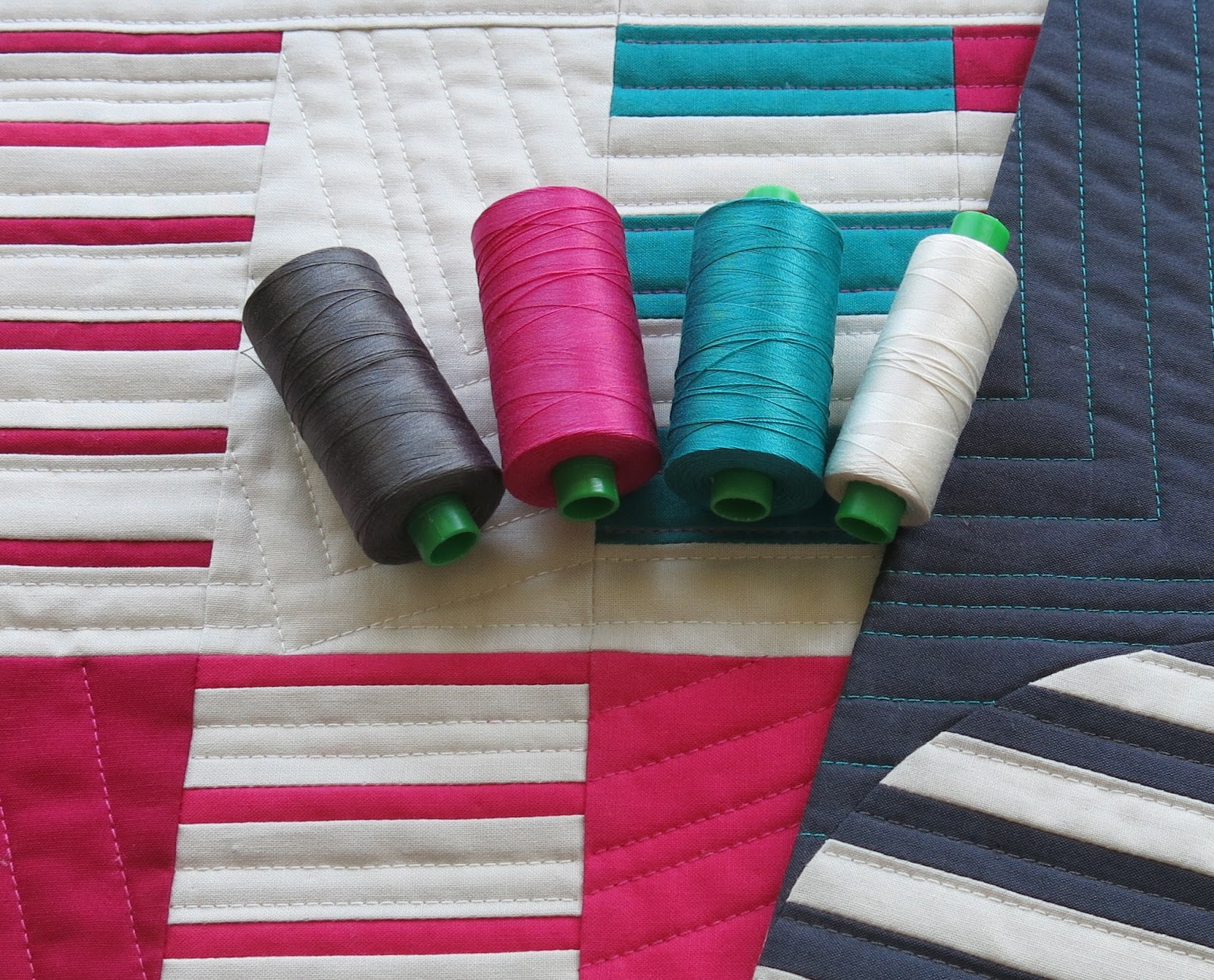 Pour le quilting, j’ai utilisé des fils Aurifil 40wt. Bien que les coloris fuchsia et jade n’étaient pas tout à fait les bons tons, ils se sont finalement mariés aux tissus. Le tissu gris foncé vient de chez Oakshott fabrics, tous les autres sont des unis de la collection Kona Cotton.
