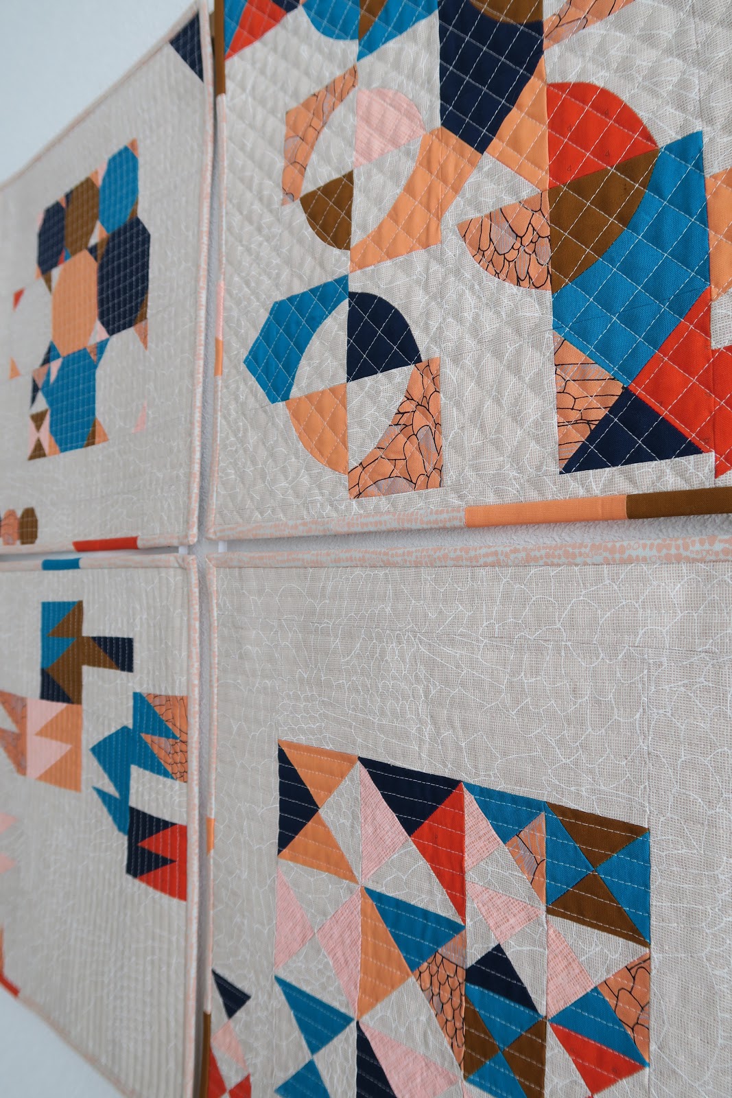 Les quatre pièces sont quiltées en lignes droites avec différents designs, horizontal, vertical, grille et grille en diagonale, pour montrer quelques options.