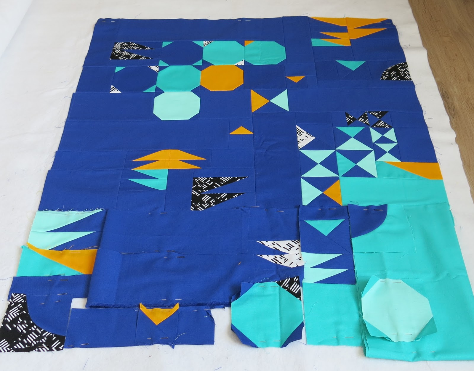 Ce sera un cours d’improvisation sur deux jours. Nous discuterons de quelques options pour la disposition et les participants devront choisir entre réaliser plusieurs minis projets ou utiliser leurs blocs dans un seul quilt. Ce projet en cours ci-dessous sera un autre exemple pour le même cours.