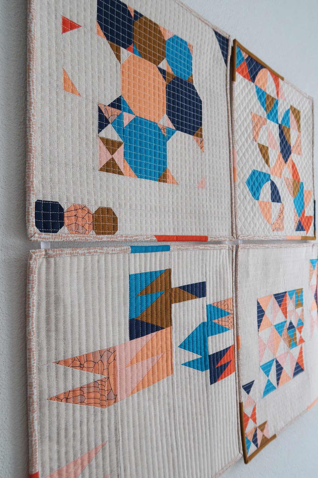 The four pieces are straight line quilted with different designs, horizontal, vertical, grid and crosshatch, to show a few options.