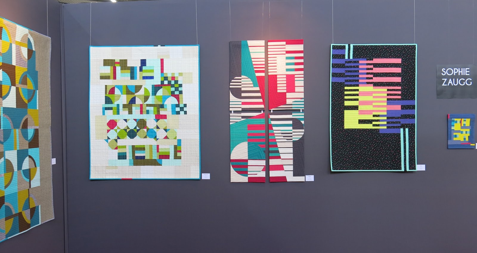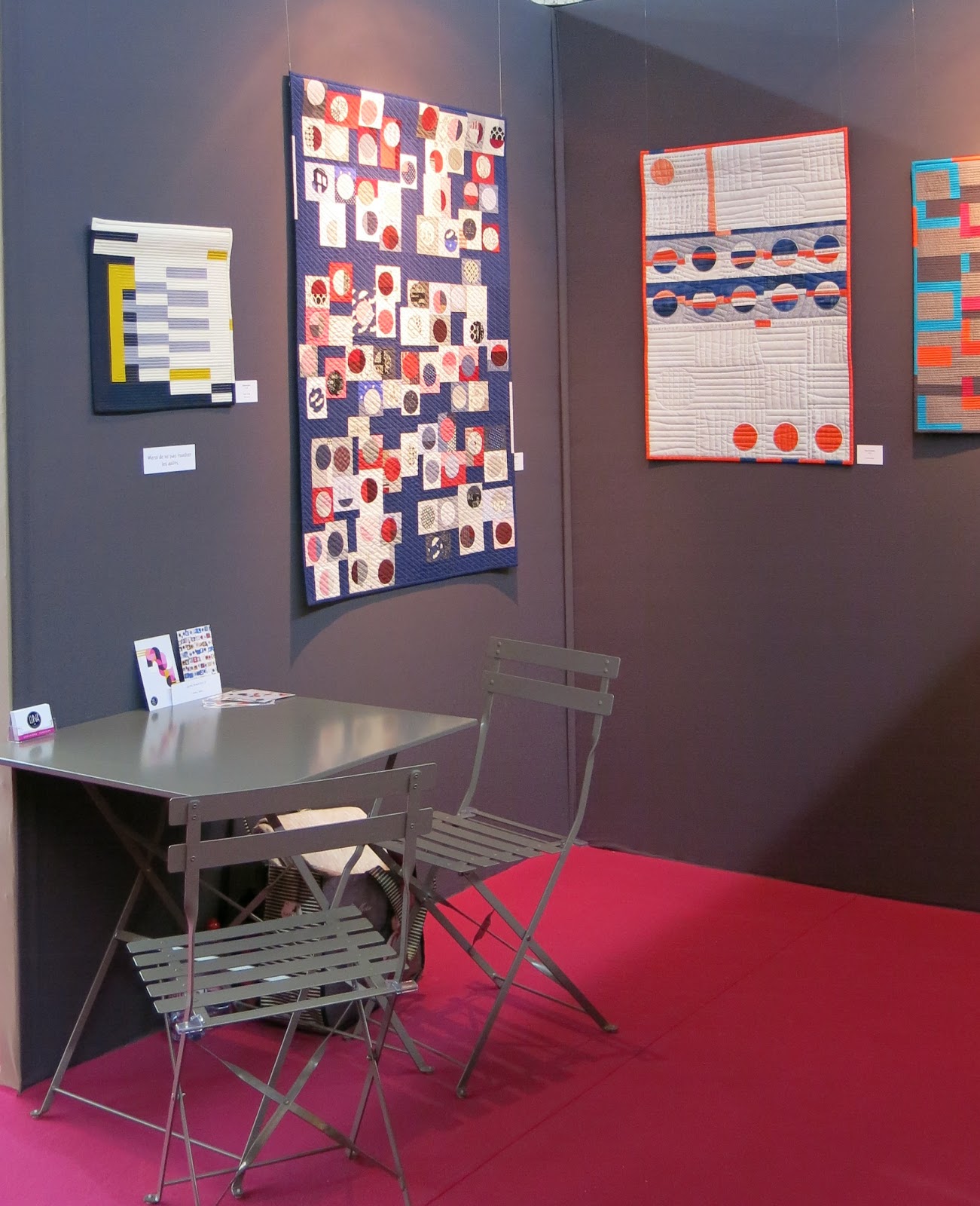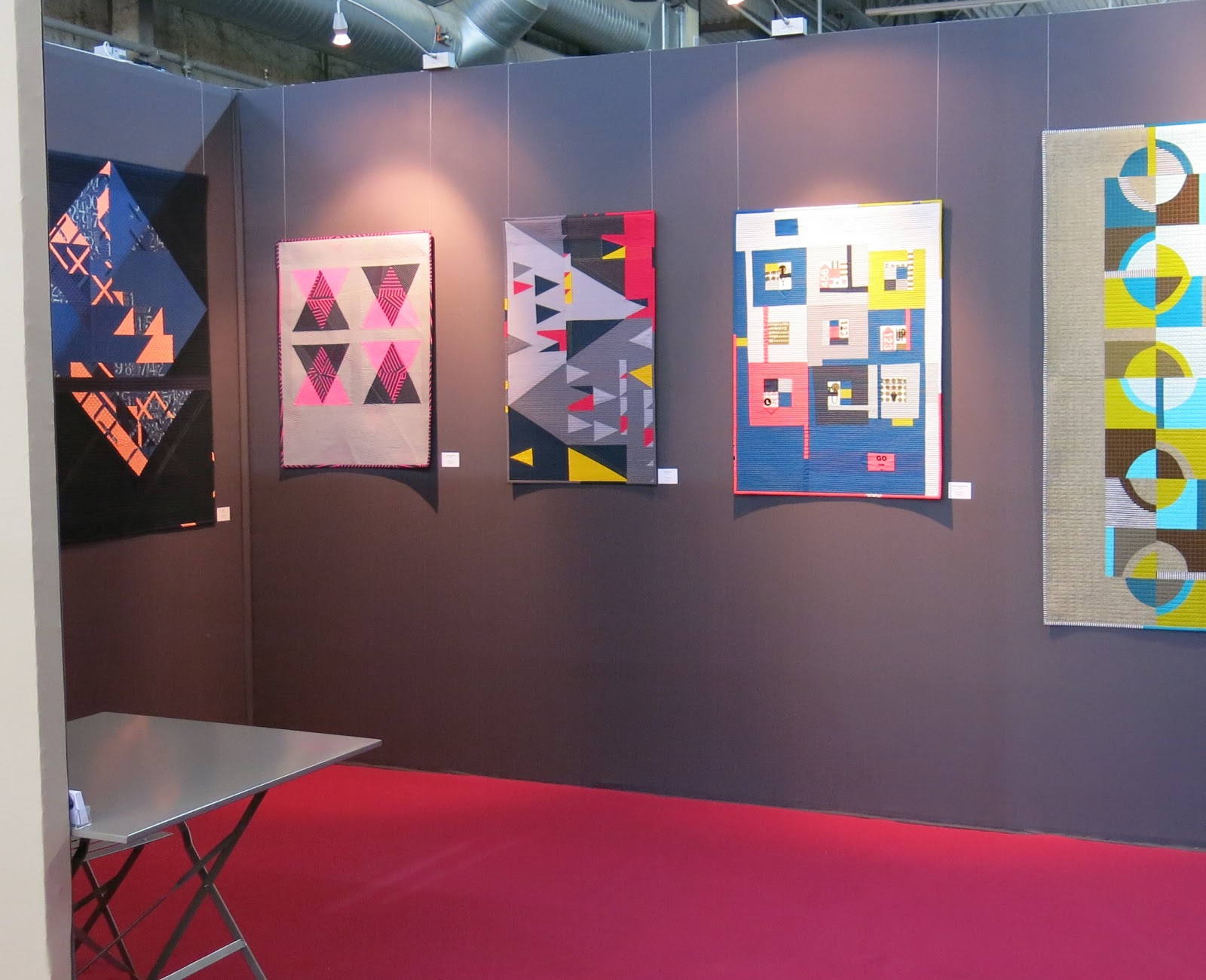 Bravo Sophie, tes quilts sont parfaitement cohérents ensemble et montrent bien l'artiste que tu es. Le fond gris est celui qu'on a en expo depuis quelques années, en remplacement de noir, il va bien avec les œuvres modernes !