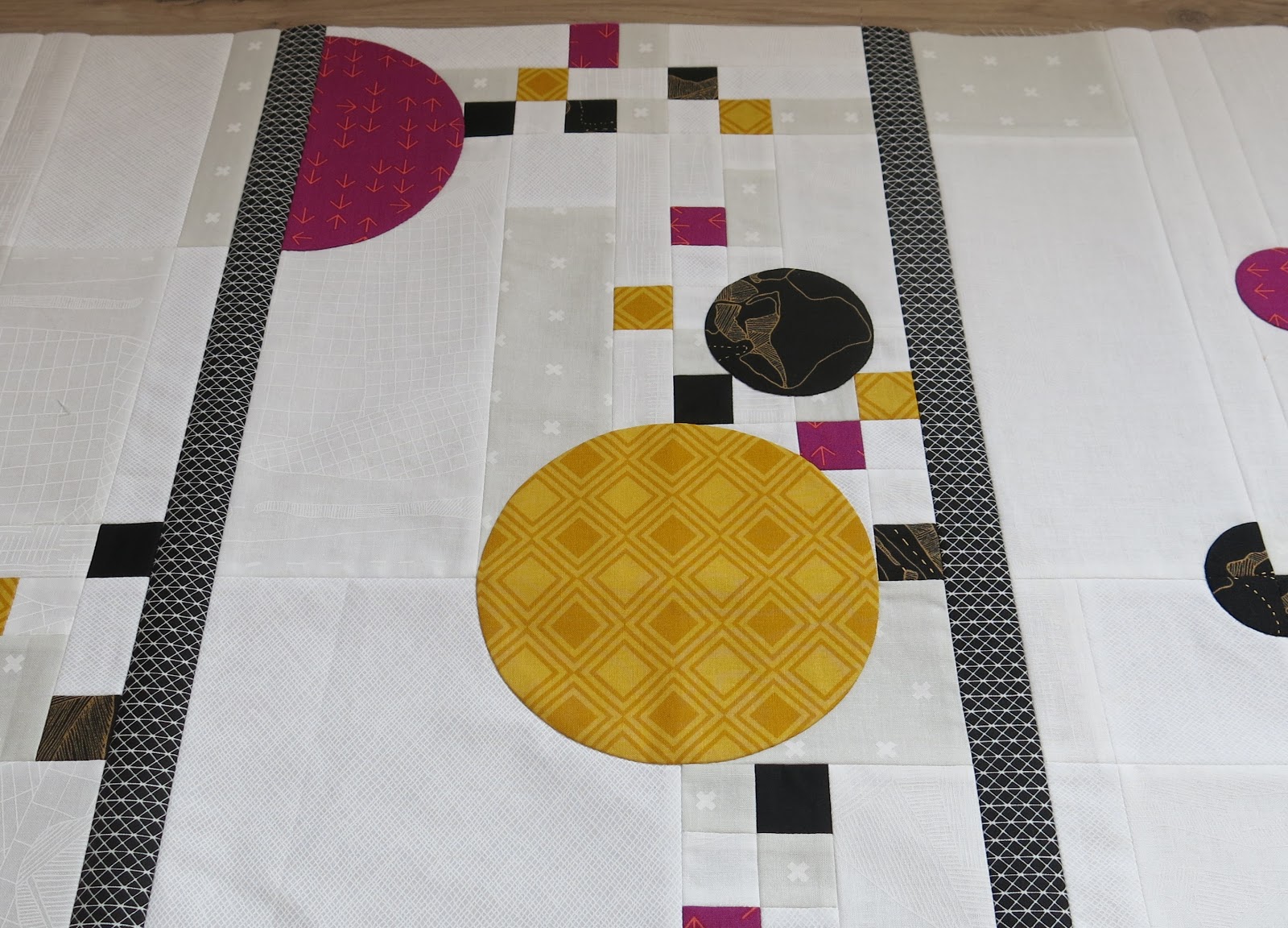 This project required that I designed a precise pattern (and more challenging that I stick to the plan … ). I used a mix of techniques for the curved pieces : hand appliqué using basting thread (circles) and Freezer Paper (quarter and half circles).
