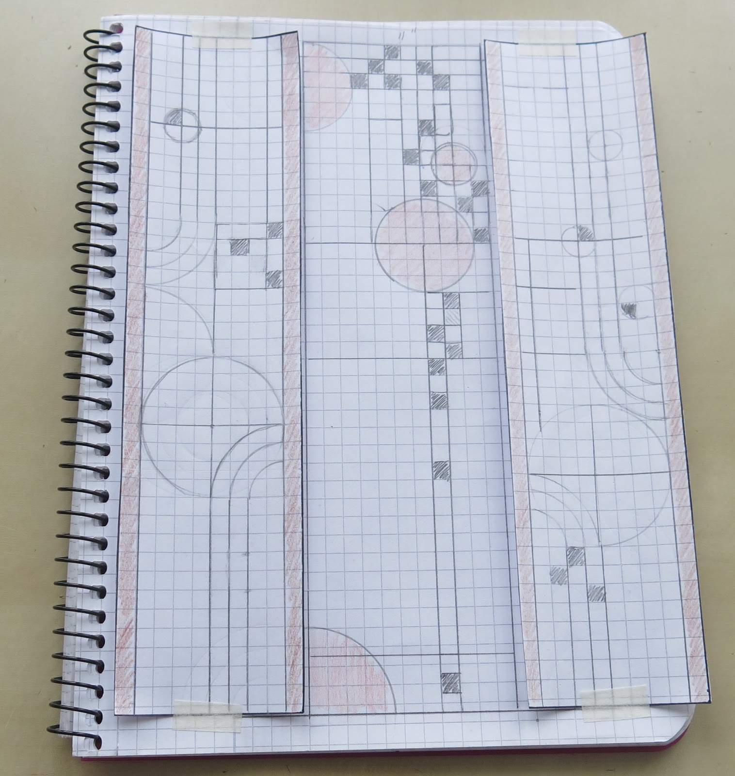 J’ai choisi différents imprimés blanc sur blanc des collections de Carolyn Friedlander avec l’idée de reproduire l’effet de l’oeuvre originale réalisée avec du verre blanc translucide. J’ai divisé mon dessin en trois sections, comme trois panneaux vitrés.