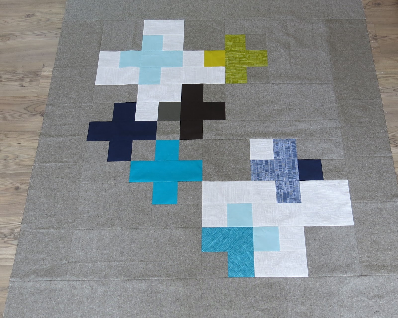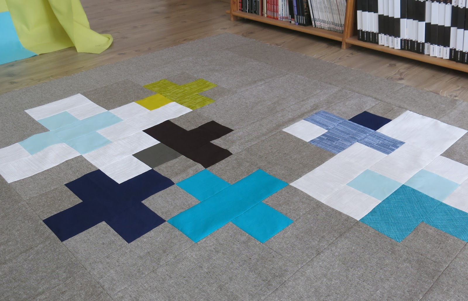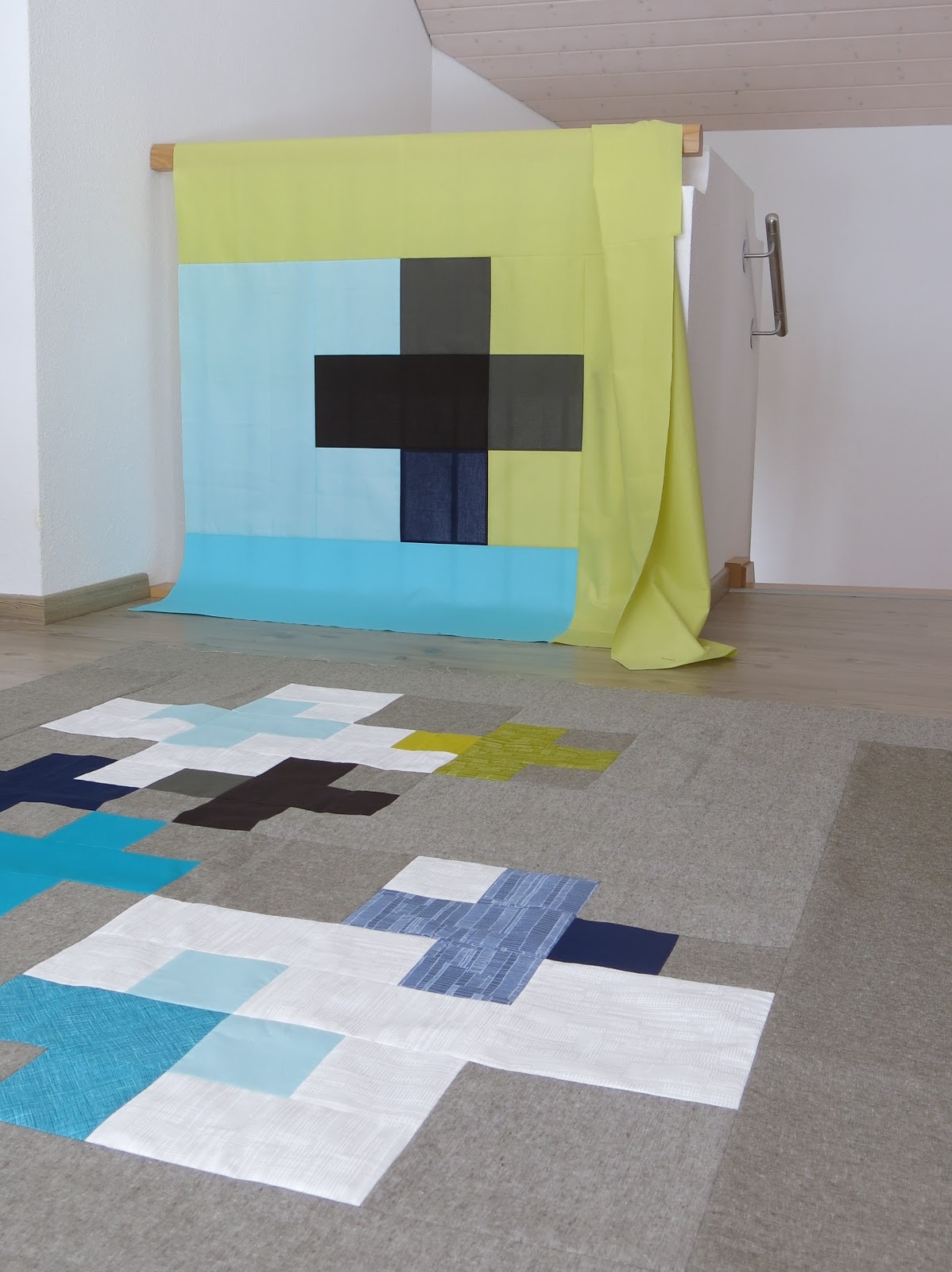 I chose colours very similar to the original since I love everything about this quilt, from design to quilting including fabric choice. I went for Essex Linen in olive for the background fabric and used for the ‘plus’ blocks some prints by Carolyn Friedlander in addition to solids. I wasn’t sure about mixing solids and prints for the transparency effect but I think it works pretty well.