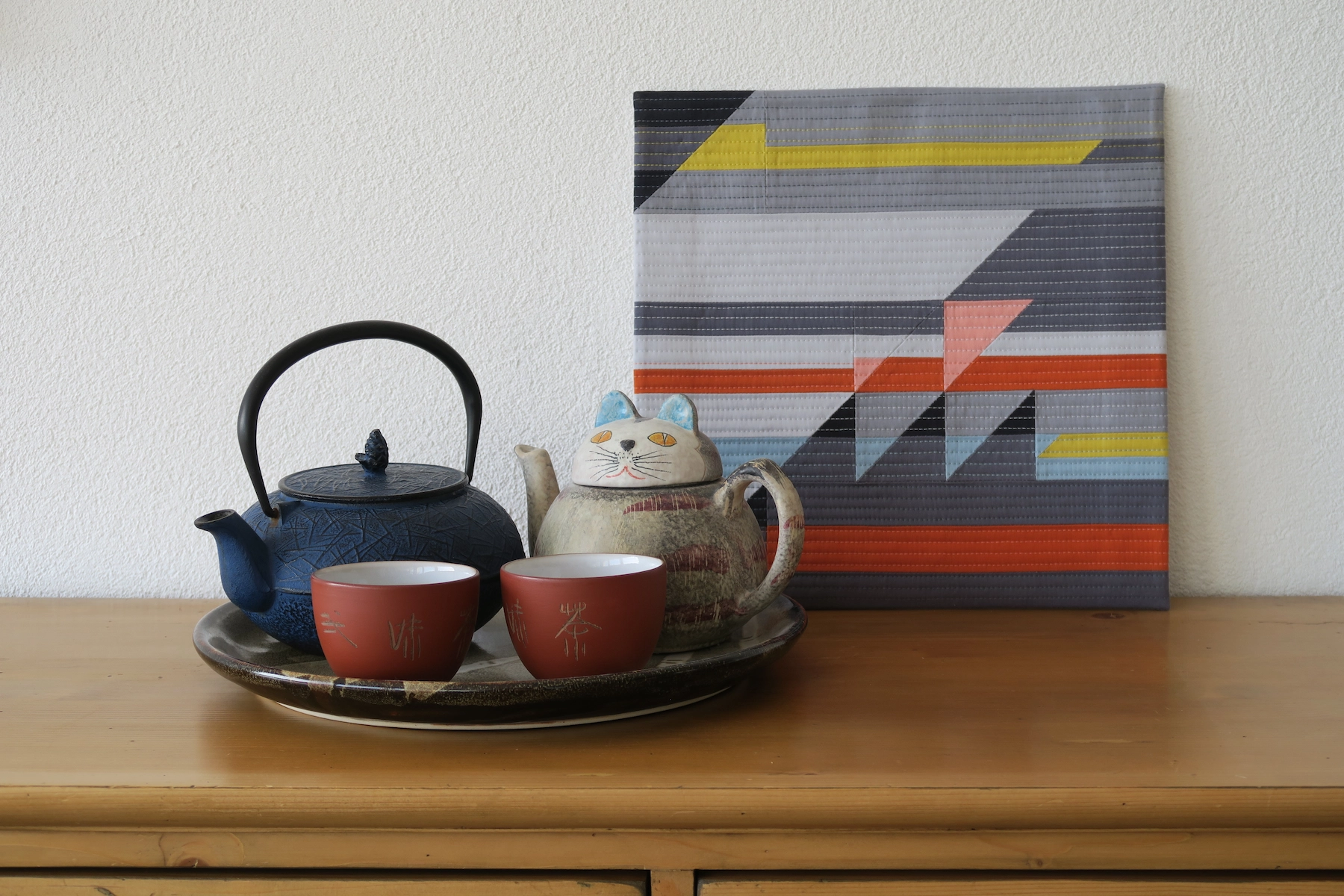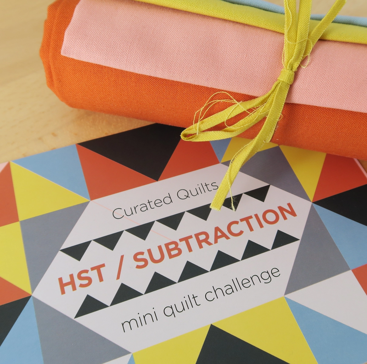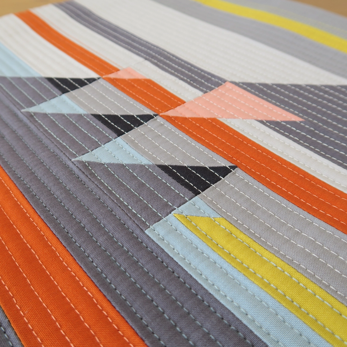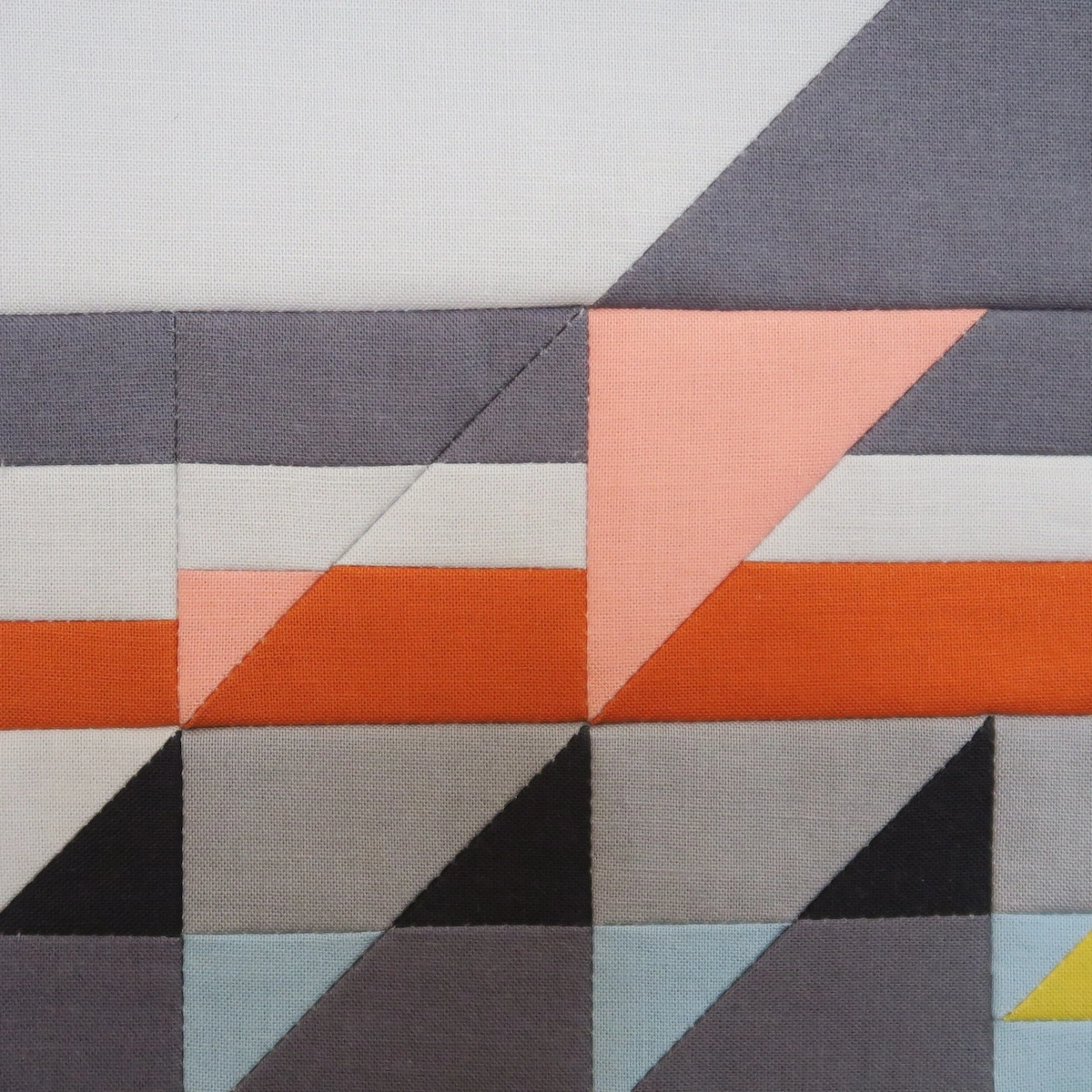 This piece was my answer to a mini quilt challenge organized by Curated Quilts magazine. The prompt was HST (Half Square Triangle) and subtraction, along with a given colour palette.
