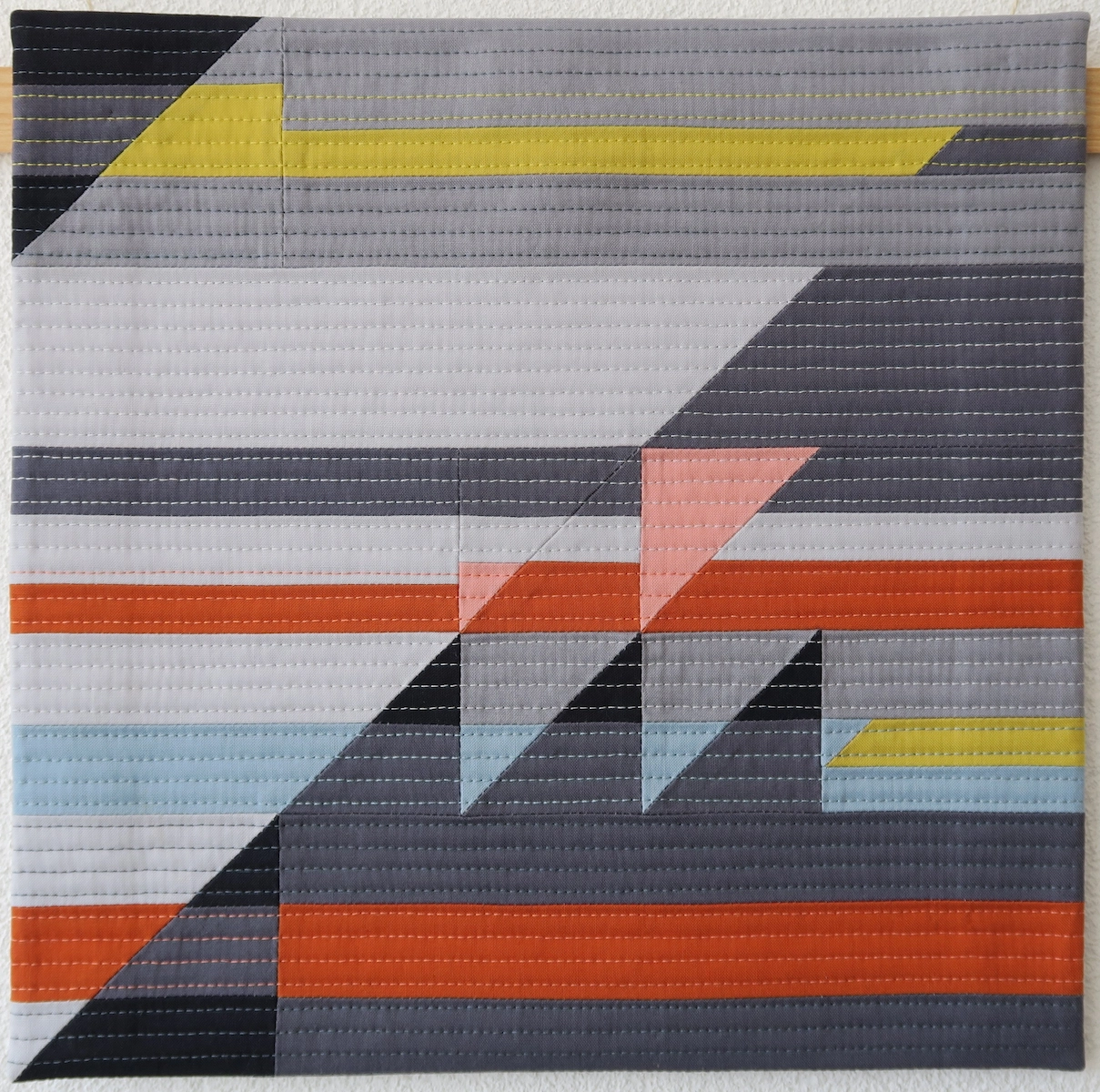Cette pièce était ma réponse à un challenge de mini quilts organisé par le magazine Curated Quilts. Le thème était HST (triangles demi-carré) et soustraction, ainsi qu’une palette de couleurs donnée.