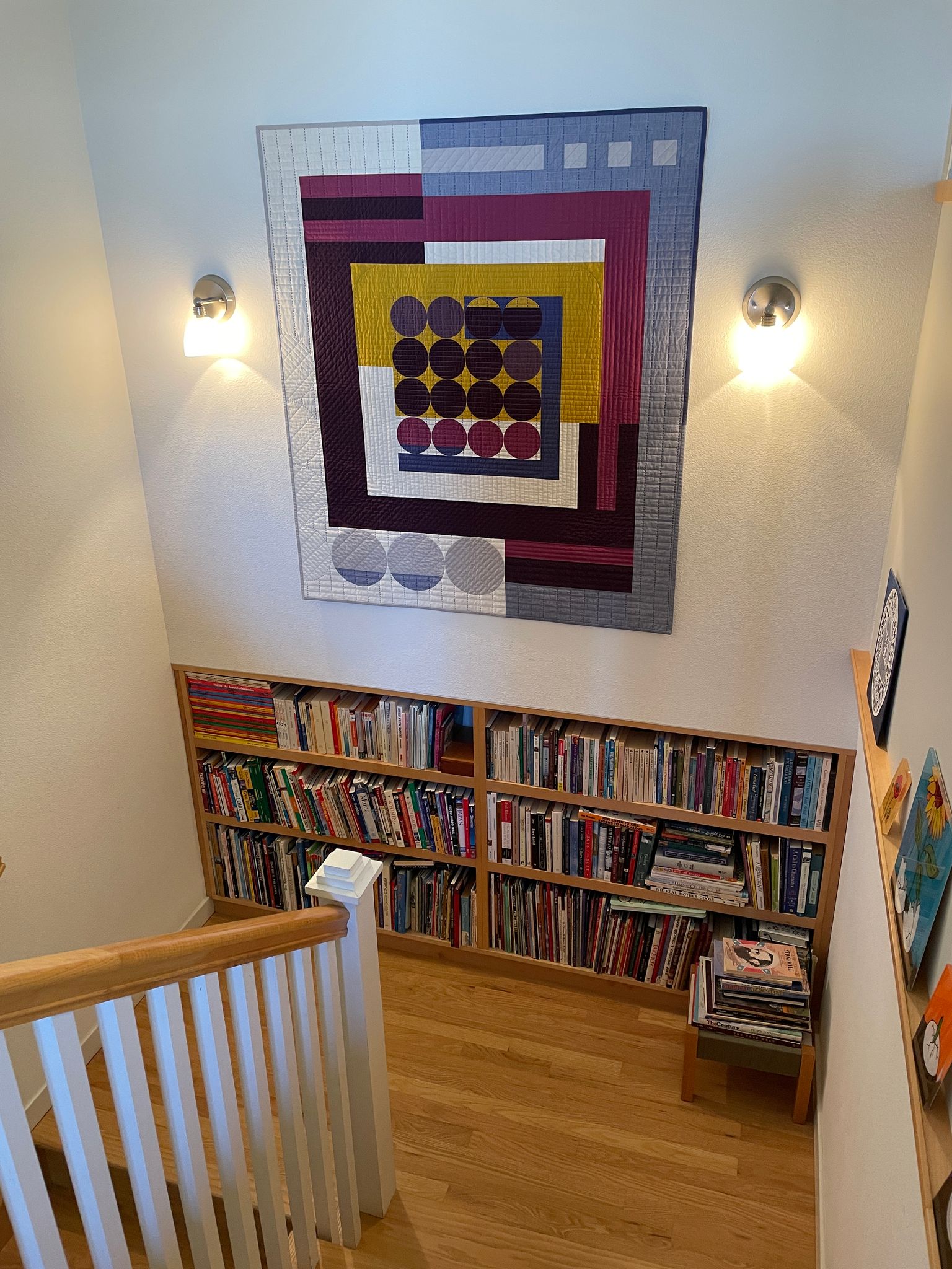 I used a Log Cabin style construction to surround and showcase hand appliqué circles. The design reminds me board and pieces in strategy board games which inspired me Gameplay as the title.