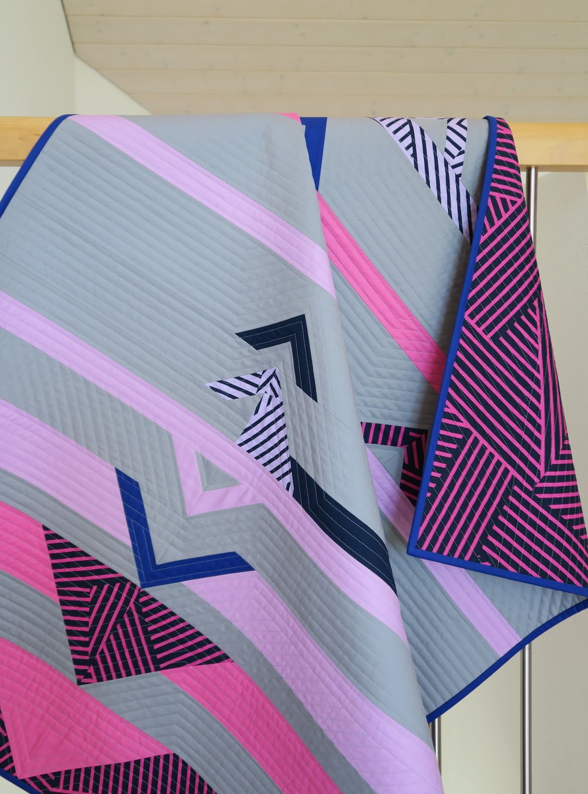 Last June, when I posted pictures of my Horizon quilt, I mentioned my intention to publish a pattern. It took me some time to get started … but this project is now well under way. I redesigned in inches my original Throw size quilt. I also did the maths for a Baby size version and made it in a completely different palette. The pattern will come in two sizes and is bilingual English and French.