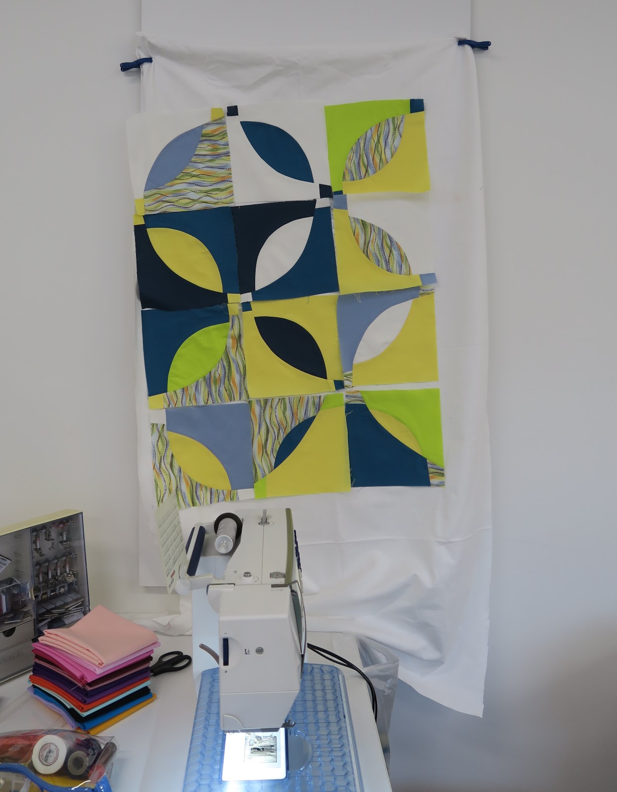 Lundi, onze personnes ont assisté à mon autre cours sur les courbes en coupe libre. Les blocs sont réalisés sans gabarit et ensuite égalisés pour être assemblés d’une manière classique. Vous pouvez voir mes exemples de cours dans des articles précédents. Un quilt terminé ici et quelques variantes de bloc ici.